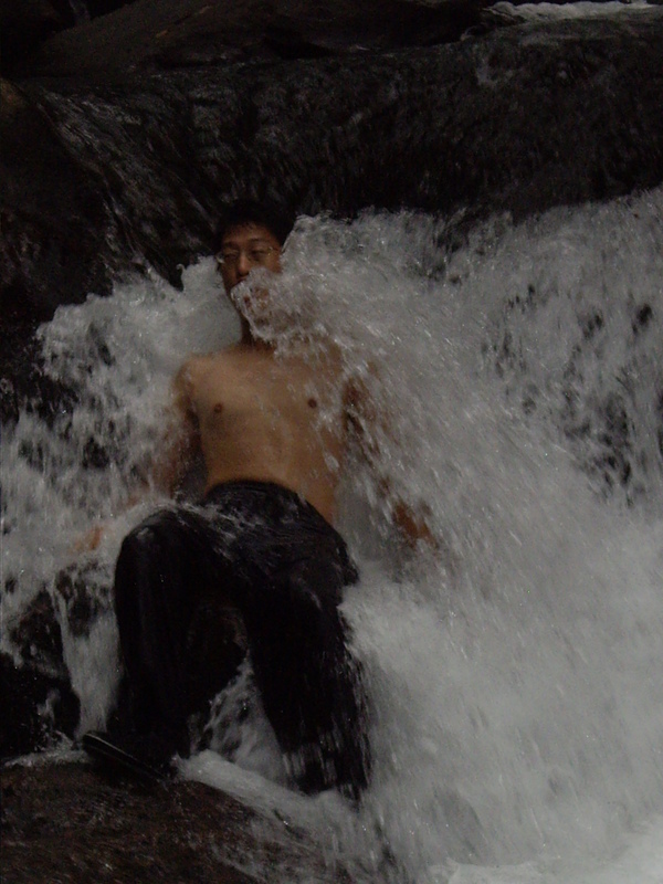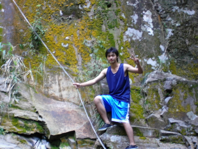 爬到M形瀑布中間高起的石頭上,脫了衣服,先淋了些水,呼~~真是太冰了!接下來就躍下石頭啦!一躍入水~~嗯~~爽!