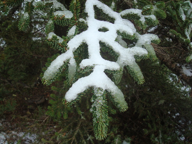 而且昨晚下的雪,還不夠深,還可以看到些綠葉的蹤跡,綠葉上覆著雪花,在山谷間搖盪著